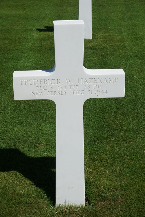 T/5 Frederick W. Hazekamp was a driver at the Weston Biscuit Company before he enlisted in Newark, New Jersey on 22 May 1943.He was killed by artillery shell fragments in his thigh.