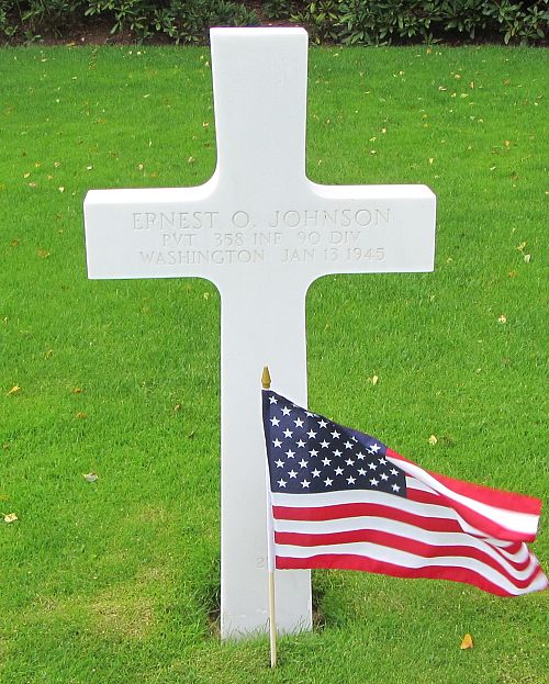 Pvt Ernest O. Johnson was a locomotive fireman before he enlisted in Portland, Oregon on 7 June 1943.He was awarded the Distinguished Service Cross Medal. The citation cited: On the night of 6 December 1944, Pvt Johnson and members of his platoon were clearing the enemy from the town of Pachten, Germany when they were subjected to fire from a large concrete pillbox which was situated in front of a house. Although in risk of being observed by enemy snipers in the vicinity, Pvt Johnson disregarding his own safety, advanced ahead of the platoon and constructed the only possible approach to the pillbox, by placing an elevated plank from a nearby house to the top of the fortification. After crawling along the plank he dropped two grenades down the ventilator and forced the surrender of the occupants. His heroic actions and courageous devotion to duty exemplify the highest traditions of military service.