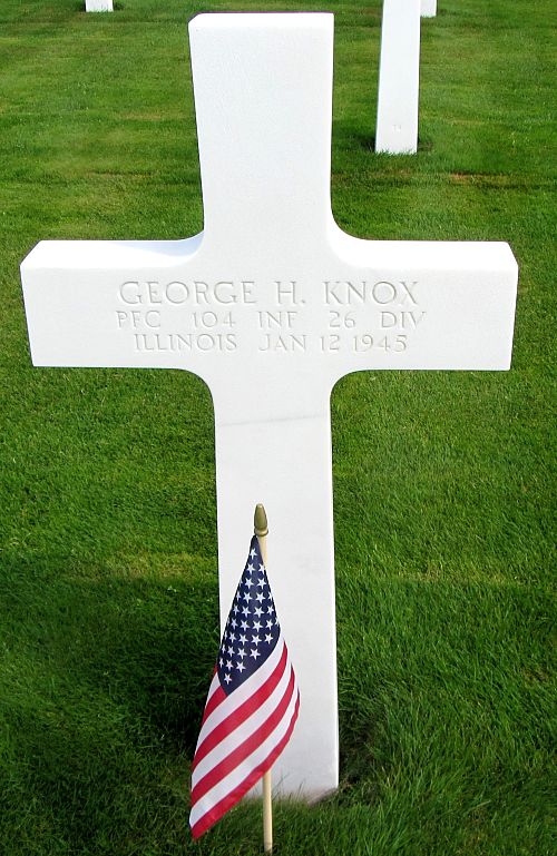 Pfc George H. Knox was a student at St. Louis University before he enlisted.Source of information: Peter Schouteten, www.abmc.gov, www.wwiimemorial.com, , www.ancestry.com - Headstone and Interment Record / 1930 Census / U.S. WWII Draft Cards Young Men / Peter W McCue III Family, www.fold3.com – 26th Infantry Division