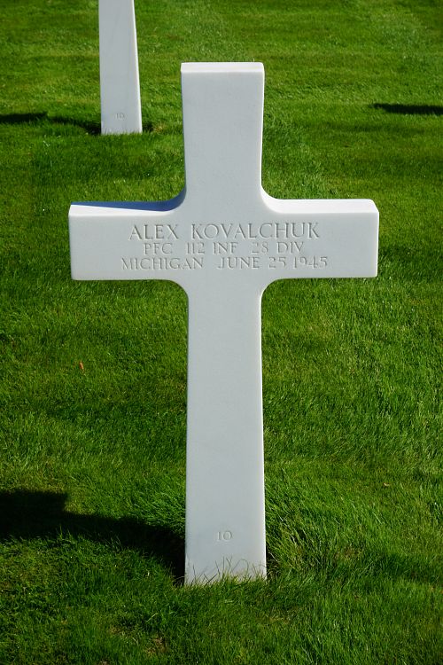 Pfc Alex Kovalchuk attended high school for two years before he enlisted.Source of information: Peter Schouteten, www.abmc.gov, www.wwiimemorial.com, www.ancestry.com - Headstone and Interment Record / 1940 Census / U.S. WWII Draft Cards Young Men, www.findagrave.com