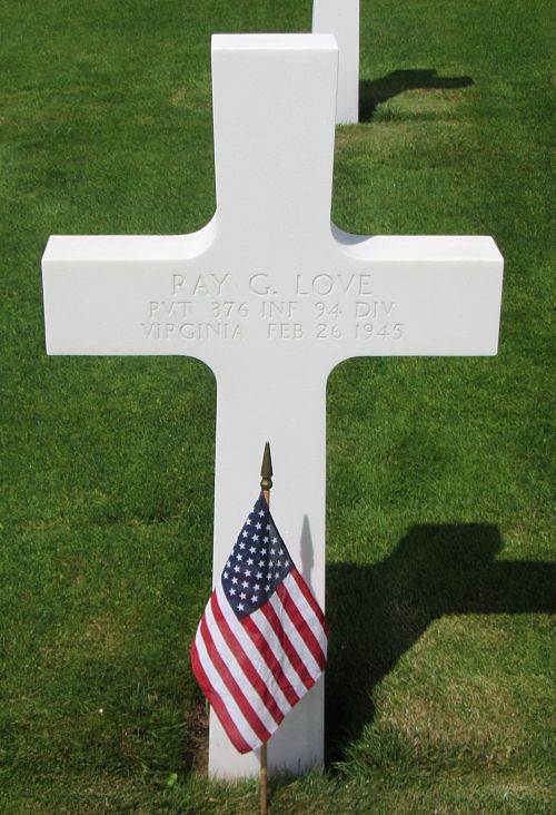 Pvt Ray G. Love was a driver before he joined the Regular Army in Richmond, Virginia on 26 July 1940.Source of information: Peter Schouteten, www.abmc.gov, www.wwiimemorial.com, www.archives.gov– WWII Enlistment Record, www.ancestry.com - Headstone and Interment Record / 1920 Census, http://www.94thinfdiv.com – Robert A. Love, www.findagrave.com