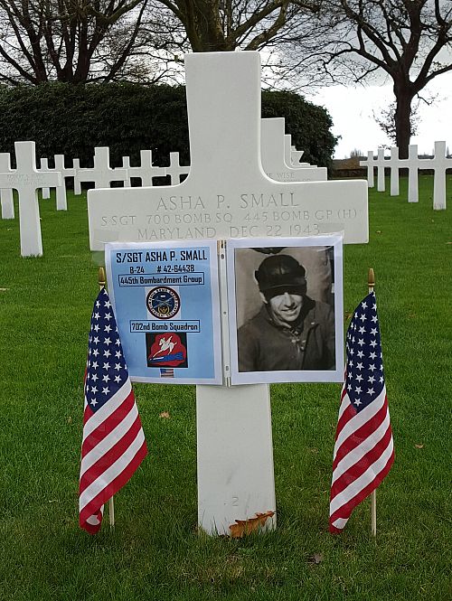 S/Sgt Asha P. Small enlisted in Baltimore, Maryland on 7 November 1942.Ship 438 was attacked by fighters at the time of bombs away. It was last seen going down out of control, and no chutes were observed. The airplane crashed around 2:30 p.m., 1 km southwest of Bolsward in a cow pasture. Their Liberator was the victim of a direct hit and set afire; they still had their bomb load, and rather than drop them on civilians, they chose to crash with their bombs. Before they finally crashed, they shot the German plane down, the pilot parachuting out and taken prisoner. The plane was burning so no one was allowed near. It burned till 7 o´clock that evening, when the bombs went off, which blew everything in all directions.