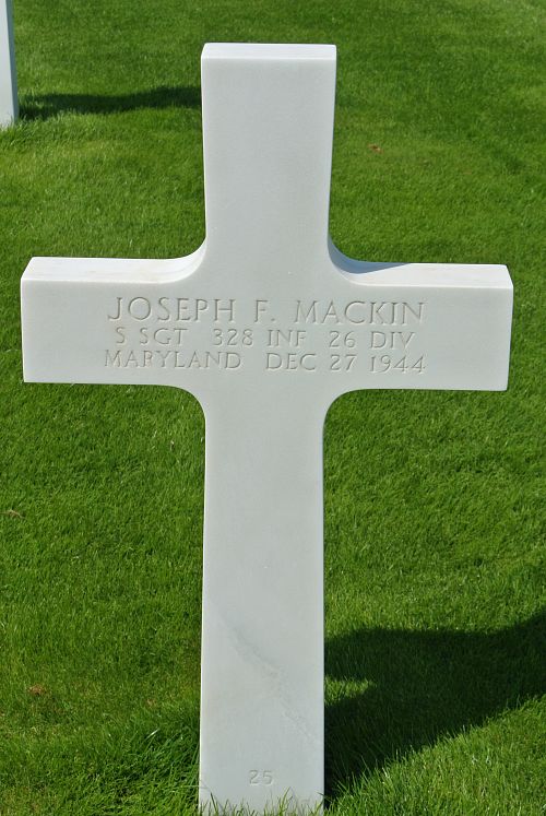 S/Sgt Joseph F. Mackin graduated from Mount St. Joseph High School and attended John Hopkins University. He was employed at the Gas and Electric Company before he enlisted in Baltimore, Maryland on 6 February 1943. He was following an ASTP course at Vanderbilt University when he was transferred to the infantry.He was directing 2nd platoon troops out on the west flank when he was killed instantly by small arms fire.