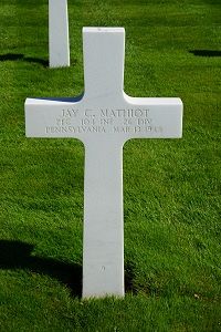 Pfc Jay C. Mathiot attended high school for two years and was employed at the Armstrong Cork Company before he enlisted in Harrisburg, Pennsylvania on 11 February 1943. He was sent overseas in May 1944.Source of information: Peter Schouteten, www.abmc.gov, www.wwiimemorial.com – Ralph R. Mathiot Jr., www.archives.gov – WWII Enlistment Record, www.ancestry.com - Headstone and Interment Record / U.S. WWII Draft Cards Young Men / Pennsylvania Veteran Compensation Application Files WWII / Quinn Family Tree, www.findagrave.com, www.fold3.com– 26th Infantry Division