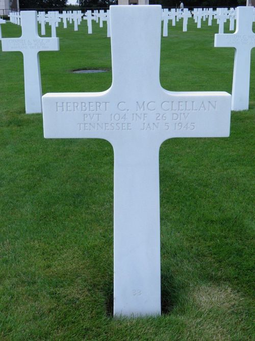 Pvt Herbert C. McClellan attended college for one year and was employed at the Hermitage Hotel in Nashville before he enlisted at Camp Forrest, Tennessee on 10 November 1941.Source of information: Peter Schouteten, www.abmc.gov, www.wwiimemorial.com, www.ancestry.com - Headstone and Interment Record / U.S. WWII Draft Young Men, www.archives.gov – WWII Enlistment Record, www.fold3.com – 26th Infantry Division