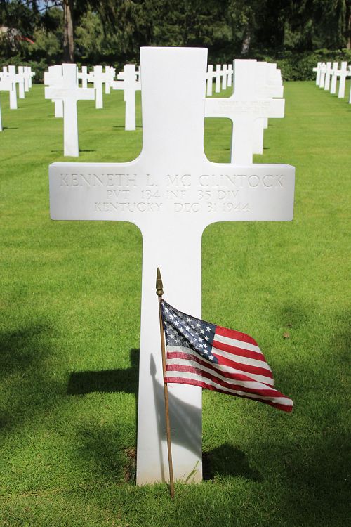 Pvt Kenneth L. McClintock attended Madison High School for three years and was employed by the Blue Grass Ordinance Depot before he enlisted at Fort Thomas, Kentucky on 4 May 1944. He was sent overseas in October 1944.He was first buried at the Temporary American Military Cemetery in Grand-Failly, France.