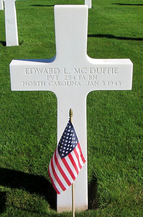 Pvt Edward L. McDuffie attended high school for four years before he enlisted at Fort Bragg, North Carolina on 1 October 1943.He was fatally wounded when a pistol, that he kept as a souvenir, accidently went off.
