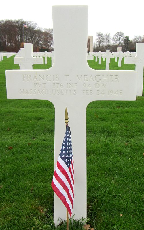 Pvt Francis T. Meagher was a waiter before he enlisted in Boston, Massachusetts on 18 August 1944.Source of information: Peter Schouteten, www.abmc.gov, www.wwiimemorial.com, www.archives.gov – WWII Enlistment Record, www.ancestry.com - Headstone and Interment Record / 1930 Census / Massachusetts Birth Index, http://www.94thinfdiv.com