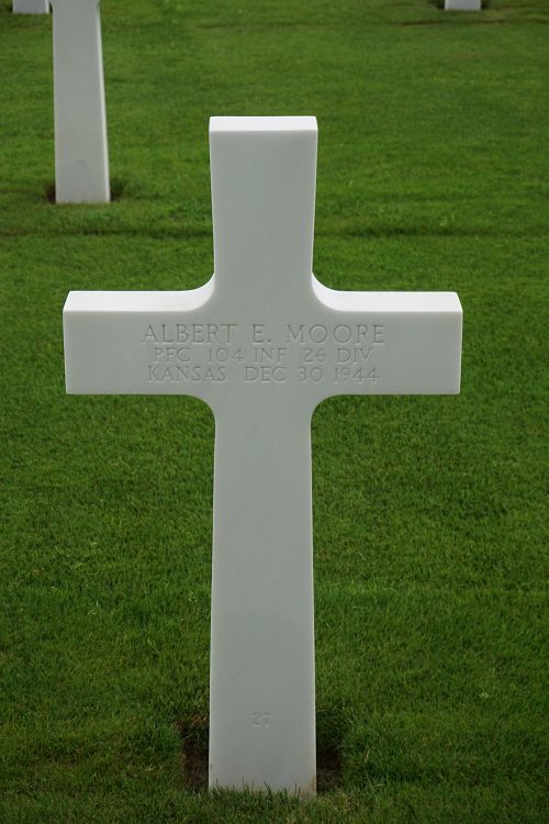 Pfc Albert E. Moore was employed at the Boeing Aircraft Co. before he enlisted.Source of information: Peter Schouteten, www.abmc.gov, www.wwiimemorial.com, www.ancestry.com - Headstone and Interment Record / U.S. WWII Draft Cards Young Men / John’s Family Tree, www.fold3.com – 26th Infantry Division