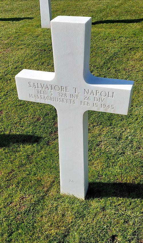 T/5 Salvatore T. Napoli attended high school for four years and was a shipping and receiving clerk before he enlisted in Boston, Massachusetts on 19 November 1942.Source of information: Peter Schouteten, www.abmc.gov, www.wwiimemorial.com, www.archives.gov - WWII Enlistment Record, www.ancestry.com - Headstone and Interment Record / U.S. WWII Draft Cards Young Men / Horvath Family Tree / 1940 Census, www.fold3.com - 26th Infantry Division