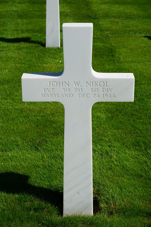 Pvt John W. Nikol was employed at the G&G Grocery Store before he enlisted at Fort George Meade, Maryland on 28 February 1944.He was killed by artillery shell fragments in the chest.
