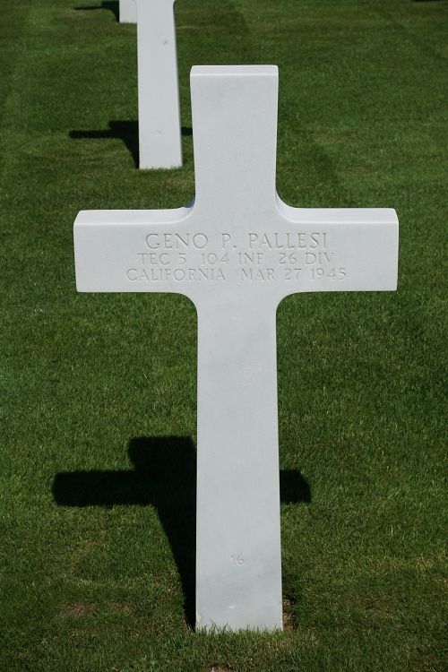 T/5 Geno P. Pallesi attended high school for four years before he enlisted in Fresno, California on 24 June 1943.He died in a field hospital to the effects of a gunshot in his chest and kidney.