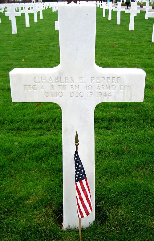 T/4 Charles E. Pepper attended high school for four years and was employed at the Firestone Tire & Rubber Company before he enlisted in Cleveland, Ohio on 24 June 1941.He was first buried at the Temporary American Military Cemetery in Grand-Failly, France.