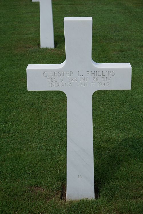 T/5 Chester L. Phillips enlisted at Fort Benjamin Harrison, Pennsylvania on 1 February 1941. He was sent overseas in August 1944.Source of information: Peter Schouteten, www.abmc.gov, www.wwiimemorial.com, www.archives.gov - WWII Enlistment Record, www.ancestry.com - Headstone and Interment Record / U.S. WWII Draft Cards Young Men, www.findagrave.com - Coleman / James M. Phillips, www.fold3.com - 26th Infantry Division