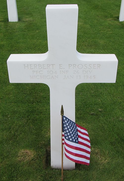 Pfc Herbert E. Prosser was reported wounded in action on 7 January 1945 and died on 13 January 1945.Source of information: Peter Schouteten, www.abmc.gov, www.wwiimemorial.com, www.ancestry.com - Headstone and Interment Record / U.S. WWII Draft Cards Young Men / Weatherill Tree, www.findagrave.com - Karen Morehouse Weixeldorfer / Richard Mullally, www.fold3.com - 26th Infantry Division