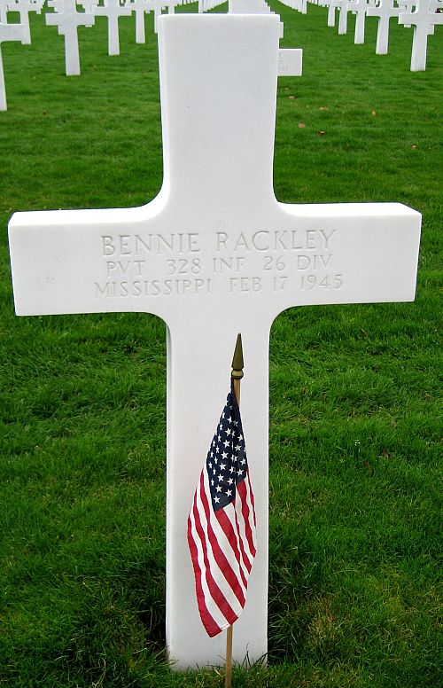 Pvt Bennie Rackley worked on a farm before he enlisted at Camp Shelby, Mississippi on 14 July 1944.He was killed by artillery shell fragments to the head and chest.
