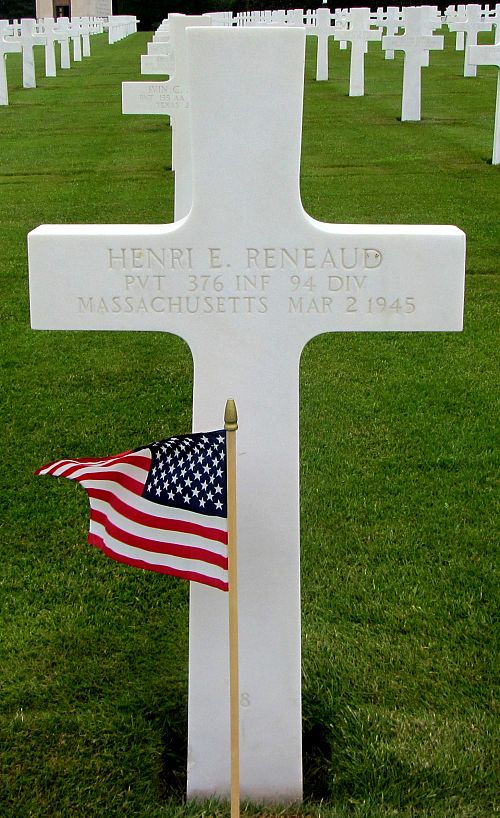 Pvt Henri E. Reneaud volunteered for the U.S. Army in Boston, Massachusetts on 1 May 1942.Source of information: Peter Schouteten, www.abmc.gov, www.wwiimemorial.com, www.archives.gov - WWII Enlistment Record, www.ancestry.com - Headstone and Interment Record, http://www.94thinfdiv.com