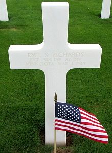 Pvt Emil S. Richards was a skilled welder and flame cutter before he enlisted at Fort Snelling Minnesota on 15 July 1944.Source of information: Peter Schouteten, www.abmc.gov, www.wwiimemorial.com – Mrs Beulah L. Richards, www.archives.gov – WWII Enlistment Record, www.ancestry.com - Headstone and Interment Record / U.S. WWII Draft Cards Young Men / 1930 Census, http://87thinfantrydivision.com