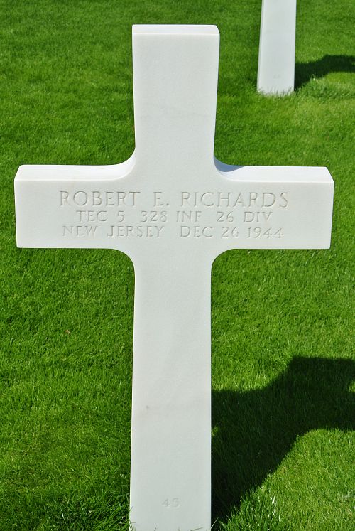 T/5 Robert E. Richards graduated from Snyder High School and worked at the Port Newark yards of the Federal Shipbuilding and Dry Dock Company.He enlisted in February 1943 and was sent overseas in October 1944.