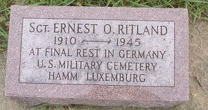 Sgt Ernest O. Ritland is remembered with a memorial marker at Zion Lutheran Church Cemetery in Garden City, Hardin County, Iowa.Source of information: André Koch, www.abmc.gov, www.wwiimemorial.com, www.ancestry.com - 1920/1930/1940 Census, Headstone and Interment Record, http://warfarehistorynetwork.com, http://cgsc.cdmhost.com/cdm/ref/collection/p4013coll8/id/3707