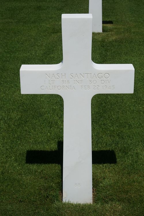 1st Lt Nash Santiago graduated from Huntington Park High School and was a stock clerk employed by Crook County, before he enlisted in Los Angeles on 22 January 1941.He was awarded the Silver Star for gallantry in action in Germany on 22 February 1945. The citation reads in part: "While attacking Mettendorf, Germany, the rifle platoon of which Lt Santiago was leader was delayed on the forward slope of a hill by severe direct enemy fire. Realizing that tank destroyers were necessary to neutralize the enemy installations and not wishing to expose any of his own men to the intense fire, he personally undertook the hazardous task of securing the aid of the armored vehicles. While darting across the open field in full view of the enemy he was mortally wounded."
