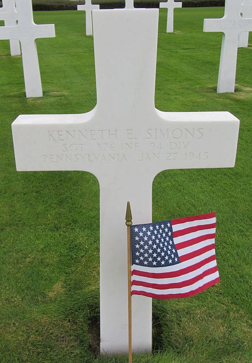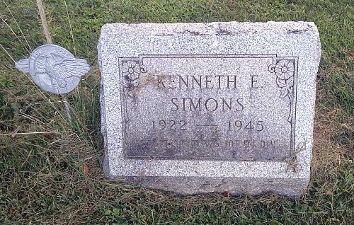 Sgt Kenneth E. Simons was a bookkeeper and cashier before he enlisted in Erie, Pennsylvania on 5 December 1942.He is remembered at Espyville Cemetery in Espyville, Crawford County, Pennsylvania with a memorial marker.