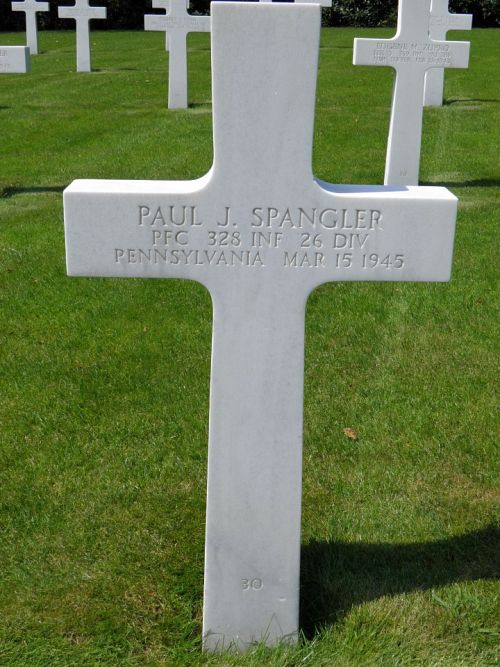 Pfc Paul J. Spangler was employed at the Mrs. Smith pie bakery before he enlisted in Harrisburg, Pennsylvania on 18 July 1944. He was sent overseas on 1 January 1945.Source of information: Peter Schouteten, www.abmc.gov, www.wwiimemorial.com, www.archives.gov – WWII Enlistment Record, www.ancestry.com - Headstone and Interment Record / U.S. WWII Draft Cards Young Men / Pennsylvania Veteran Compensation Application Files WWII / Strausbaugh Descendants Family Tree, www.findagrave.com, www.fold3.com – 26th Infantry Division, www.newspapers.com – The Evening Sun 9 April 1945