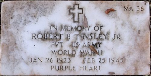 Pvt Robert B. Tinsley Jr. graduated from St John's School in Gulfport and was employed by the Ingalls Shipyard in Pascagoula.He enlisted in Camp Shelby, Mississippi on 20 July 1944.