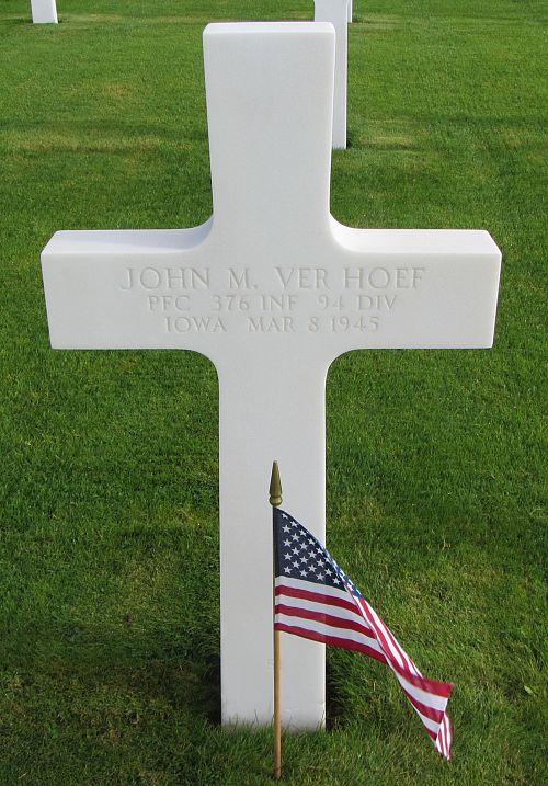 Pfc John M. Ver Hoef worked on a farm before he enlisted at Fort Snelling, Minnesota on 19 August 1944.Source of information: Peter Schouteten, www.abmc.gov, www.wwiimemorial.com, www.archives.gov - WWII Enlistment Record, www.ancestry.com - Headstone and Interment Record / Butlin Family Tree, http://www.94thinfdiv.com, www.findagrave.com