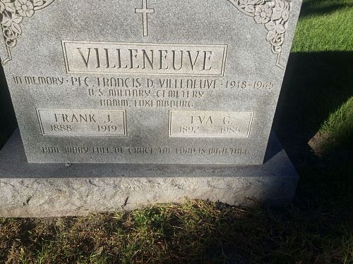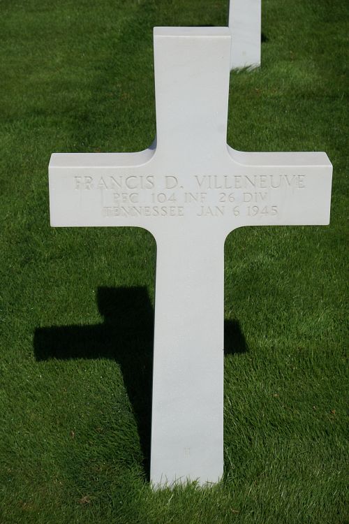 Pfc Francis D. Villeneuve attended Student Engineering College at the University of Michigan before he enlisted.Source of information: Peter Schouteten, www.abmc.gov, www.wwiimemorial.com, www.ancestry.com - Headstone and Interment Record / U.S. WWII Draft Cards Young Men / Jean Baptiste Desend, www.findagrave.com, www.fold3.com - 26th Infantry Division