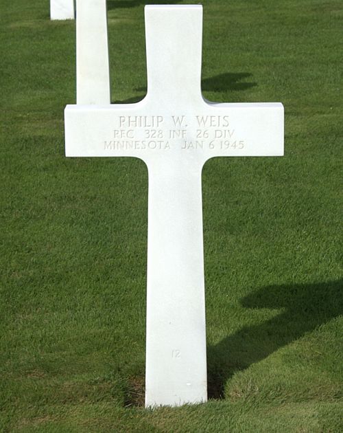 Pfc Philip W. Weis graduated from Technical High school and was employed at the De Zurik Shower company in Sartell before he enlisted on 4 March 1943. He was sent overseas in September 1944.Pfc Weis was killed only six miles from the former home of his grandfather, whoimemigrated to Minnesota in 1871.