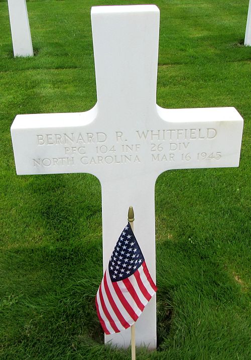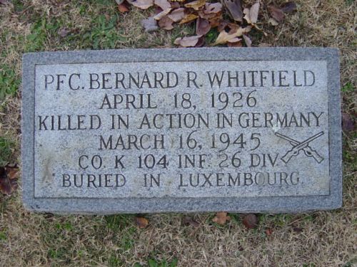 Pfc Bernard R. Whitfield attended high school for four years before he enlisted at Fort Bragg, North Carolina on 22 August 1944.He was killed by artillery shell fragments in his chest.
