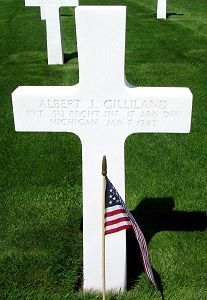 Pvt Albert J. Gilliland was first buried at the Temporary American Military Cemetery of Grand Failly, France.Source of information: Peter Schouteten, Dr. Brian Piazza - great cousin, www.abmc.gov, www.wwiimemorial.com, www.ancestry.com - Headstone and Interment Record / 1930 Census / U.S., Social Security Death Index, http://www.ww2-airborne.us