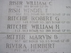 His brother S/Sgt Orville A. Ritchie served 20 months in Western Pacific as a Gunner on a B-29. He was wounded in February 1945 and received his discharge from the Army Air Forces in November 1945.