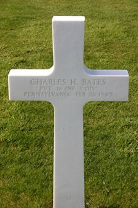 Pvt Charles H. Bates enlisted in New Cumberland, Pennsylvania on 29 April 1944. He worked on a farm before he enlisted. He was awarded the Silver Star (Posthumously) for gallantry in action.Pvt Charles H. Bates first buried at Temporary American Military Cemetery Henri-Chapelle, Belgium Block VVV, Row 10, Grave 195.