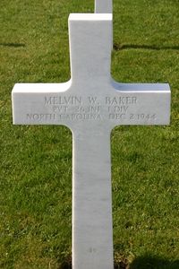 Pvt Melvin W. Baker enlisted at Fort Bragg, North Carolina on 6 April 1944. He was formerly employed with Burlington Mills before he enlisted.He received his basic training in the infantry at Fort McClellan, Alabama and after an 11-day furlough with his wife and their daughter, reported to Fort Meade in Maryland.