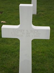 Sgt Beck was leading his machine gun section in an attack against the enemy near Silbach, Germany when he was instantly killed by shrapnel in the head caused by enemy artillery fire. He was originally buried at Ittenbach American Cemetery in Germany on 8 April 1945 but was evacuated to Margraten and reburied there on 30 August 1945. He was again disinterred on 20 September 1948 and his remains were prepared and placed in a casket on 21 September 1948. he was given his final resting place on 26 January 1949.