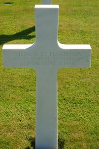 T/Sgt Thomas C. Hamilton was an electrician before he enlisted in Chicago, Illinois on 19 March 1942.The aircraft was shot down by enemy fighters. The bombardier, 1st Lt Wilton H. Power, stated that they left the formation between the IP and the target. The pilot, co-pilot, bombardier, top turret, ball turret, tail gunner, radioman and right waist gunner all bailed out. He believed that everyone was out but Hamilton, left waist gunner, who was shot during action and he was almost positive about his death. He also states that all other members were in good condition, except for minor wounds. However, after interviewing parachuting crewman of other shot down B-17´s that day, he believes the remainder of his crew, pilot, top turret, ball turret, tail gunner and right waist gunner were all shot in their parachutes as they were descending.