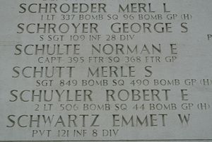 Sgt Merle S. Schutt graduated from Steuben High School where he was the president of the Camera Club, Journal Staff photographer and agent and Intramural Swim Winner. He was summarized as having "perpetual exuberance".The airplane was shot down by flak over the target on 10 January 1945.