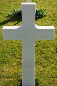 Thomas D. Bittinger graduated from Sunbury High School and Susquehanna University. Upon completion of his second year in college, he aligned with the preparedness program as a civilian employee at the Middletown Air Depot, where he remained until he joined the colors. Sgt Bittinger volunteered for service in October, 1942. He was assigned to the Army Air Corps in Rapid City, South Dakota. Upon completion of his training, he was a member of a crew to ferry their bomber from Lincoln, Nebraska, to the British Isles in September, 1944. They became members of the Eight Air Force, 94th Bomber Group of the 410th Bomber Squadron.This aircraft was observed to drop out of formation 1,5 minutes before bombs away. When leaving the formation the aircraft made a dive downward, spin several times and then leveled off. It is reported that it is believed that a burst of flak hit the aircraft in the bomb bay area. Three chutes were observed to leave the aircraft.