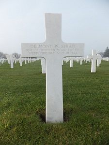 Delmont Strait enlisted on 27 October 1942 in Pittsburgh, Pennsylvania.His plane was lost in mid-air collision on a mission to Koblenz, Germany. They collided with aircraft 42-99949. Both planes crashed near Ingelmunster, Belgium. The occupants of the other aircraft were all accounted for. All crewmembers of aircraft 42-94969 were killed. An account of the burial of the victims listed twelve persons from both aircraft, 8 identified and 4 unidentified. A report submitted by Captain Felletier, 466 Air Liaison Section, 1st Canadian Army, 145 Wing, R.A.F. stated that he located 8 bodies completely burnt in this aircraft, the front gunner, still in position.