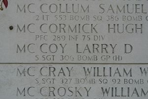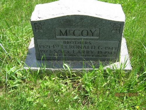 S/Sgt Larry D. McCoy is remembered on the burial marker of his brother, 1st Lt Ronald G. McCoy, at Fort Palmer Cemetery in Ligonier, Westmoreland County, Pennsylvania.