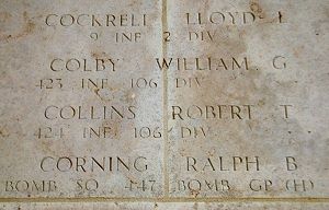 Robert T. Collins was a graduate of New Brunswick High School and worked at the DuPont plant.He enlisted on 20 April 1943 in Newark, New Jersey and received his training in the Army Air Corps. He was doing M.P. duty in Greensboro, North Carolina, when, at his own request, he was transferred to the infantry in August 1944.