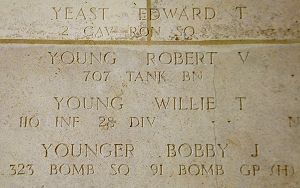 Willie Young was a farmer before he enlisted on 8 June 1942 at Fort Bragg, North Carolina and was sent overseas in September 1943.He was reported slightly wounded in action on 17 September 1944 and after recovering in a hospital in France, returned to duty with his outfit on 22 October 1944.
