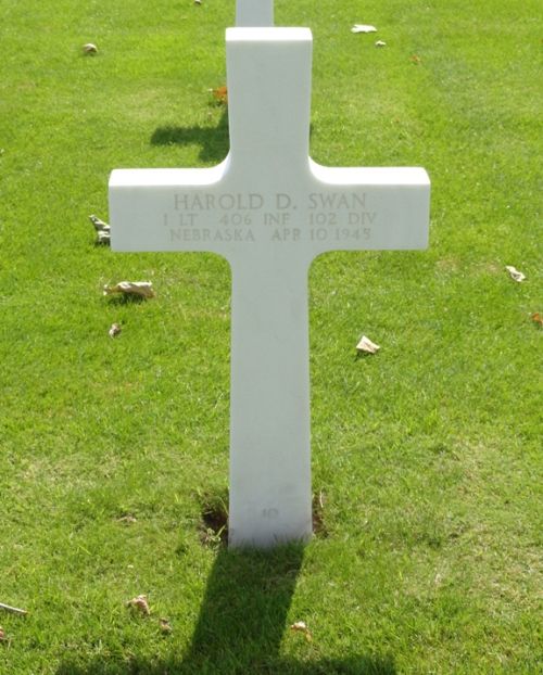 1st Lt Harold D. Swan received a B.A. degree from the University of Nebraska and was working on a law degree at the time he enrolled in the R.O.T.C. in March 1942 at Fort Benning, Georgia. He was sent overseas in September 1944.He was reported wounded in action on 23 February 1945. Released from a hospital in Belgium on 14 March 1945, Swan had just returned to combat on 22 March 1945,