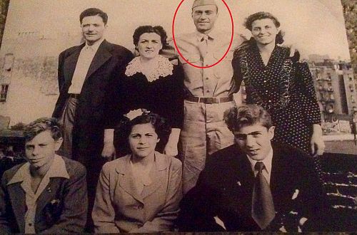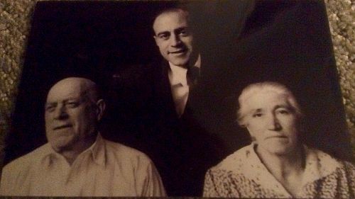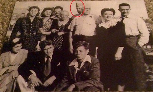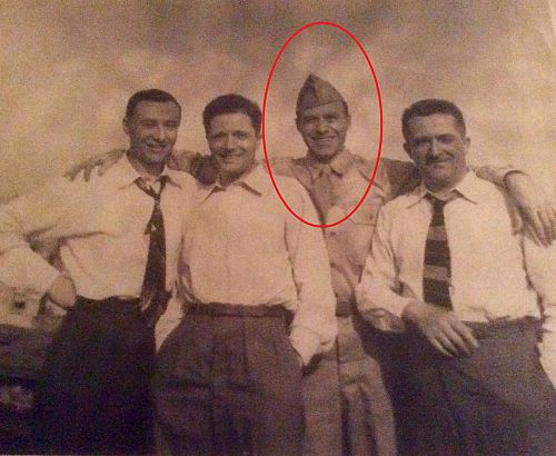 One picture shows John J. Brugnoli with his brothers-in law before heading oversees. One other shows him with his parents, with two of his siters and a brother-in-law and one is a family picture with his mother, father, sisters, brother-in-laws, niece and nephews.