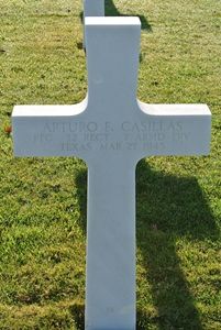 Pfc Arturo F. Casillas attended high school for 2 years and was chef at Sheffield's Grill in Corpus Christi. He enlisted at Fort Sam, Houston, Texas on 25 May 1944 and was sent overseas in January 1945.In April 1948 his burned remains were found inside a knocked out tank and were evacuated to Ardennes Cemetery where they were given their final resting place on 30 June 1949.