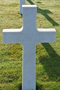 Pvt Vernon E. Cox enlisted at Fort Sill, Oklahoma on 3 April 1944. He attended high school for 3 years and was a chauffeur before he enlisted.The remains of Pvt Cox were found in Vossenack and initially registered as Unknown X-6050. He was evacuated to Ardennes Cemetery and could be identified at the research facilities.