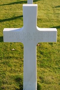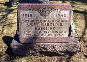 At 4903N 0831E A/C 659 received a direct flak burst between #1 and #2 engines and burst into flames. A/C peeled out of formation to the right and went into a tight spin, exploding about 5000 feet below formation. Although weather conditions hampered visibility, one to four chutes were reported as having been seen leaving the A/C. Harold Hainline didn't bail out. He was trapped in the tail position.Harold D. Hainline is remembered with a memorial marker in Elm Grove Cemetery at Saint Marys, Auglaize County, Ohio.