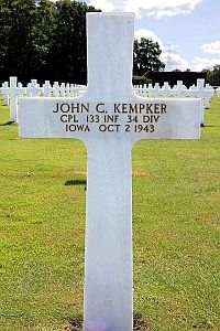 John C. Kempker attended St. Joseph High School where he graduated in 1940 and worked as a clerk. He joined the National Guard in Le Mars, Iowa on 10 February 1941.Cpl John C. Kempker first buried at the Temporary American Military Cemetery in Avellino, Italy. and is now buried next to his brother 2nd Lt Edward J. Kempker.